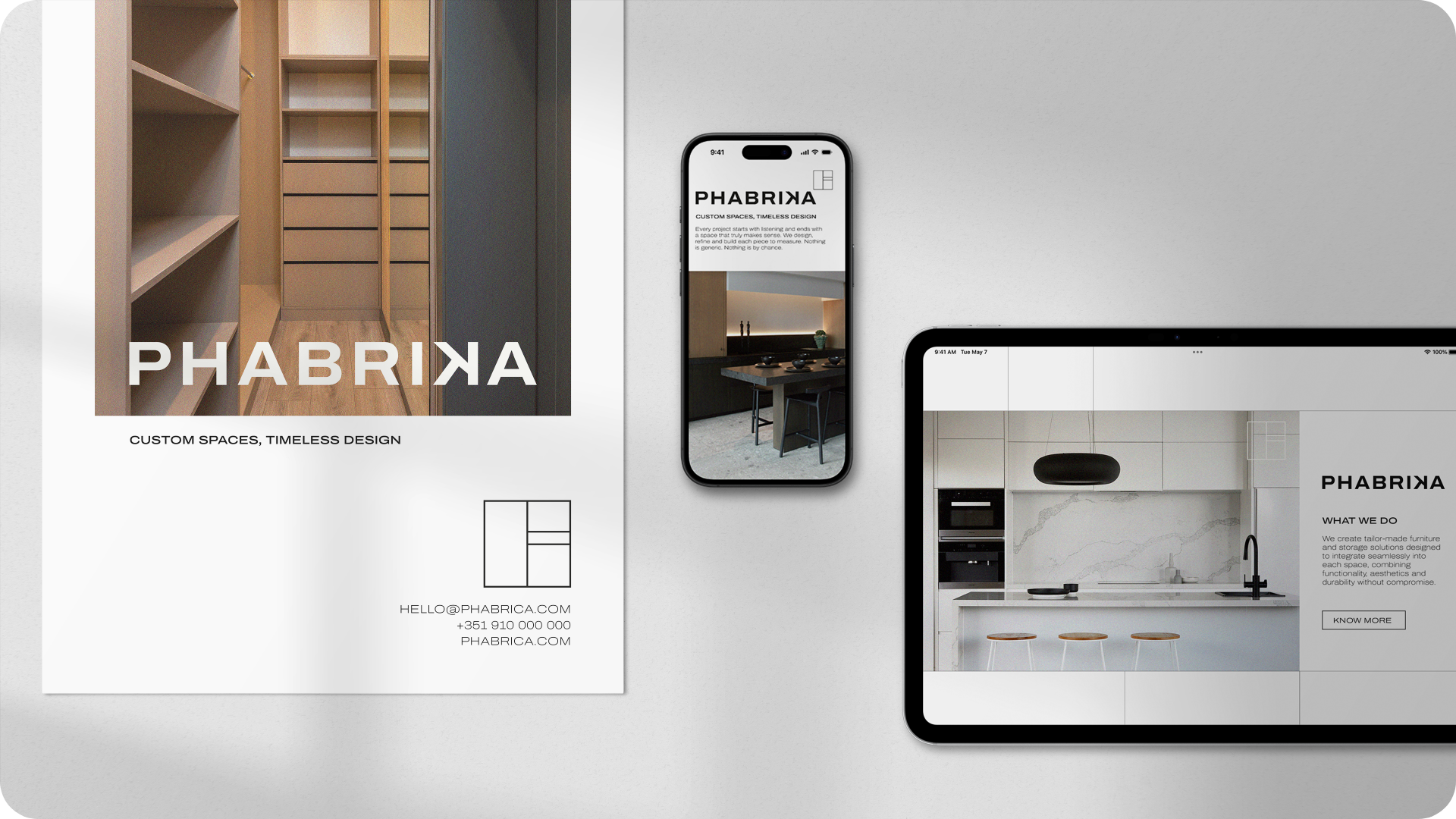The brand identity is born from the essence of its own products: clean lines, precise forms and materials that speak for themselves. The visual language follows a modern, minimal and timeless approach, inspired by the textures and geometries present in Phabrika’s creations.